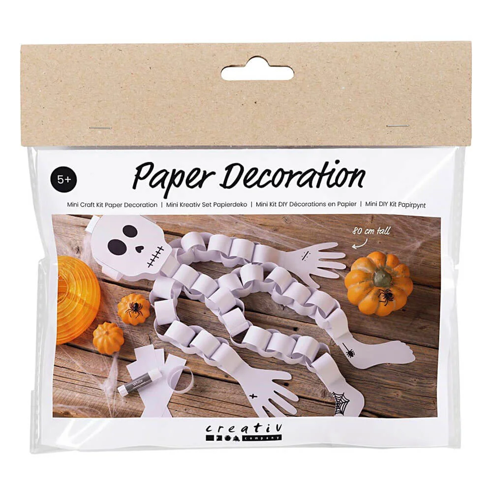 Als je dit jaar met Halloween je eigen decoraties wilt maken, dan is deze Mini Hobbyset de perfecte oplossing. Samen met de kinderen kun je een leuk rammelend papieren skelet maken. Het is ontzettend eenvoudig en kinderen vanaf 5 jaar kunnen dit project al afronden. Het skelet is gemaakt van papieren slingers en de kinderen kunnen er zelfs leuke details op tekenen met stiften.
