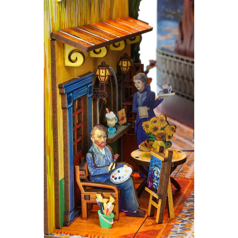 Beleef een bijzonder moment uit het leven van Vincent van Gogh met Tonecheer’s Book Nook – Vincent’s World. Hier zie je Van Gogh zitten op het terras van zijn geliefde café in het pittoreske Arles, Frankrijk. Een dienster brengt hem een Irish coffee, terwijl hij geïnspireerd wordt door de sterrennacht boven de Rhône. Dit unieke bouwpakket combineert twee van zijn beroemde schilderijen tot één betoverende scène.
